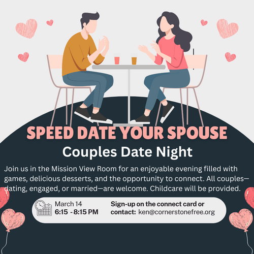 The class will meet during the second service at 10:45 AM from March 22nd to May 3rd. Books are available for $20 per couple, and childcare is provided.