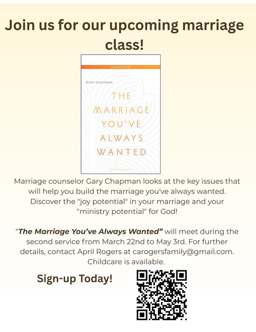 Married couples are invited to join our upcoming class, "The Marriage You've Always Wanted," featuring insights from counselor Gary Chapman. This course explores key issues to help you strengthen your relationship and discover your "joy potential" and "ministry potential" together.